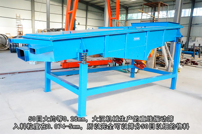 50目指在一平方英寸的面積上有50個孔,50目大約等0.28mm,大漢機械生產的直線振動篩入料粒度在0.074-5mm,所以完全可以篩分50目以細的物料。同時直線振動篩適合篩分物料含水量要小于70%、無粘性的各種干式粉狀物料。