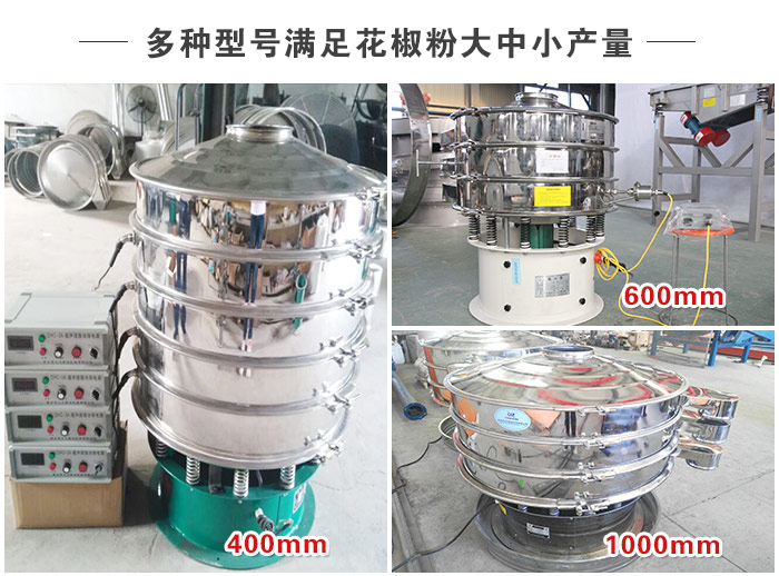 花椒粉除雜振動篩的型號分為直徑400mm、600mm、800mm、1000mm、1200mm、1500mm、1800mm、2000mm等八種標(biāo)準(zhǔn)機(jī)型。