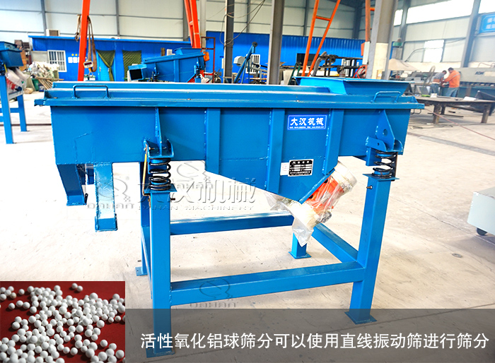 活性氧化鋁球為白色球狀多孔性顆粒,粒度均勻,表面光滑,機械強度大,吸濕性強,粒徑通常為1mm-10mm,根據活性氧化鋁球的物料特性和基本篩分環(huán)境要求參考,直線振動篩是可以用來篩分活性氧化鋁球的。