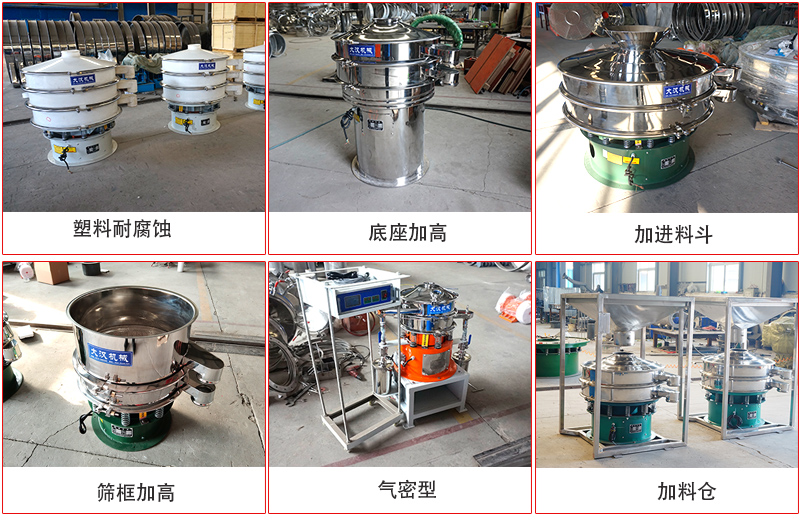 從材質上分標準型旋振篩和普通型旋振篩的,標準型的是與物料接觸部分為304不銹鋼材質,底座為碳鋼材質,普通型的通體為普碳鋼材質,旋振篩型號是從φ400-φ1800mm直徑,旋振篩價格根據材質和直徑大小、層數價格不同。 旋振篩設備可以根據客戶的需求設計型號,0-400目都可以篩選,不管是液態的,還是漿狀的0-600目都可以過濾。"大漢"旋振篩系列產品同時配備專門的篩網清理裝置,如彈跳球、超聲波篩分系統、轉筒刷等,降低網風險。