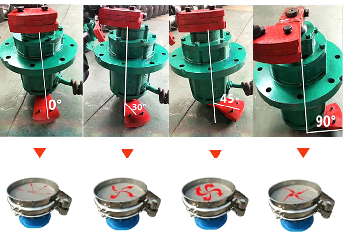 2、當(dāng)你想讓篩面上的物料迅速向四周擴(kuò)散或是加快擴(kuò)散時,需要把旋振篩的電機(jī)夾角調(diào)小,比如調(diào)到30度,或是20度,或是更小,角度越小物料向四周擴(kuò)散的越快,反之就會越慢,當(dāng)角度達(dá)到90度時,物料就會向篩面中心集中。