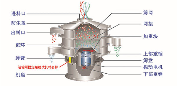 圓形旋振篩主要由振動電機,篩網,清網裝置,網架,減震彈簧,底座等部組成。