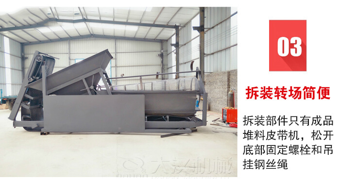 設(shè)備的高度整體性便于施工現(xiàn)場(chǎng)存放或轉(zhuǎn)場(chǎng)運(yùn)輸,拆裝部件只有成品堆料皮帶機(jī),松開(kāi)底部固定螺栓和吊掛鋼絲繩,將成品皮帶機(jī)塞入主框架底面即可。