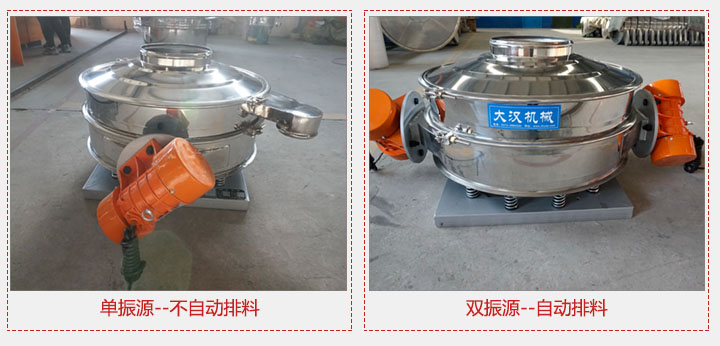 直排篩分單振源與雙振源兩種,其中單振源直排篩用到物料上主要產生上下振動,無自動排料功能,而雙振源直排篩使物料在篩面表面產生漩渦運動,有自動排料功能。