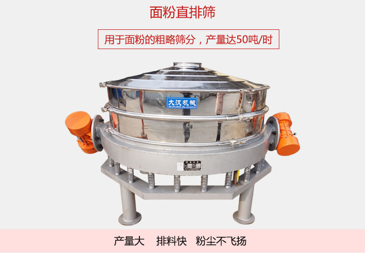 面粉直排篩上安裝的振動電機利用其上下端的兩組偏心塊的相位角以及兩臺電機之間的交叉角度,將振動電機的旋轉運動變為:水平,垂直,傾斜以及離心作用,再將這種作用力傳遞給篩面,達到篩分的目的。