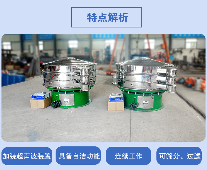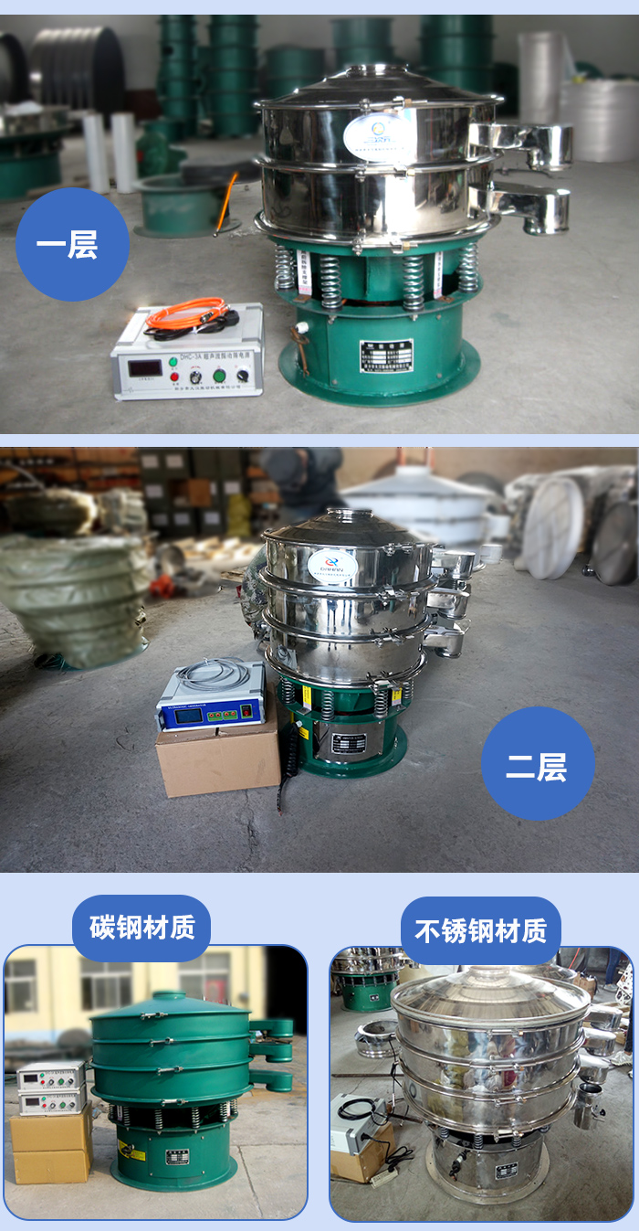 產品簡介:超聲波振動篩利用超聲波頻率振動篩網,振動頻率可達每秒36000次,可使細粉狀物料在篩網上形成微懸浮狀態,能更快地通過篩網而不產生靜電和粘在篩網上,篩分精度可提高80%以上,產量提高2-5倍。